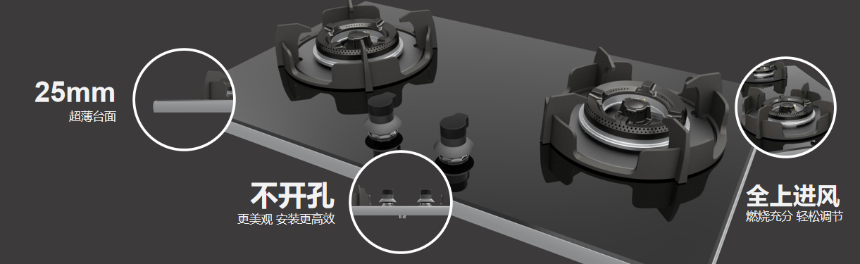 第二款產(chǎn)品是平板式燃氣灶。基于大多燃氣灶臺面開孔、后期滲水等痛點,庫靈圖研發(fā)了一款超薄平板燃氣灶,安裝無需開孔,同時采用上進風設(shè)計,避免廚柜開孔。